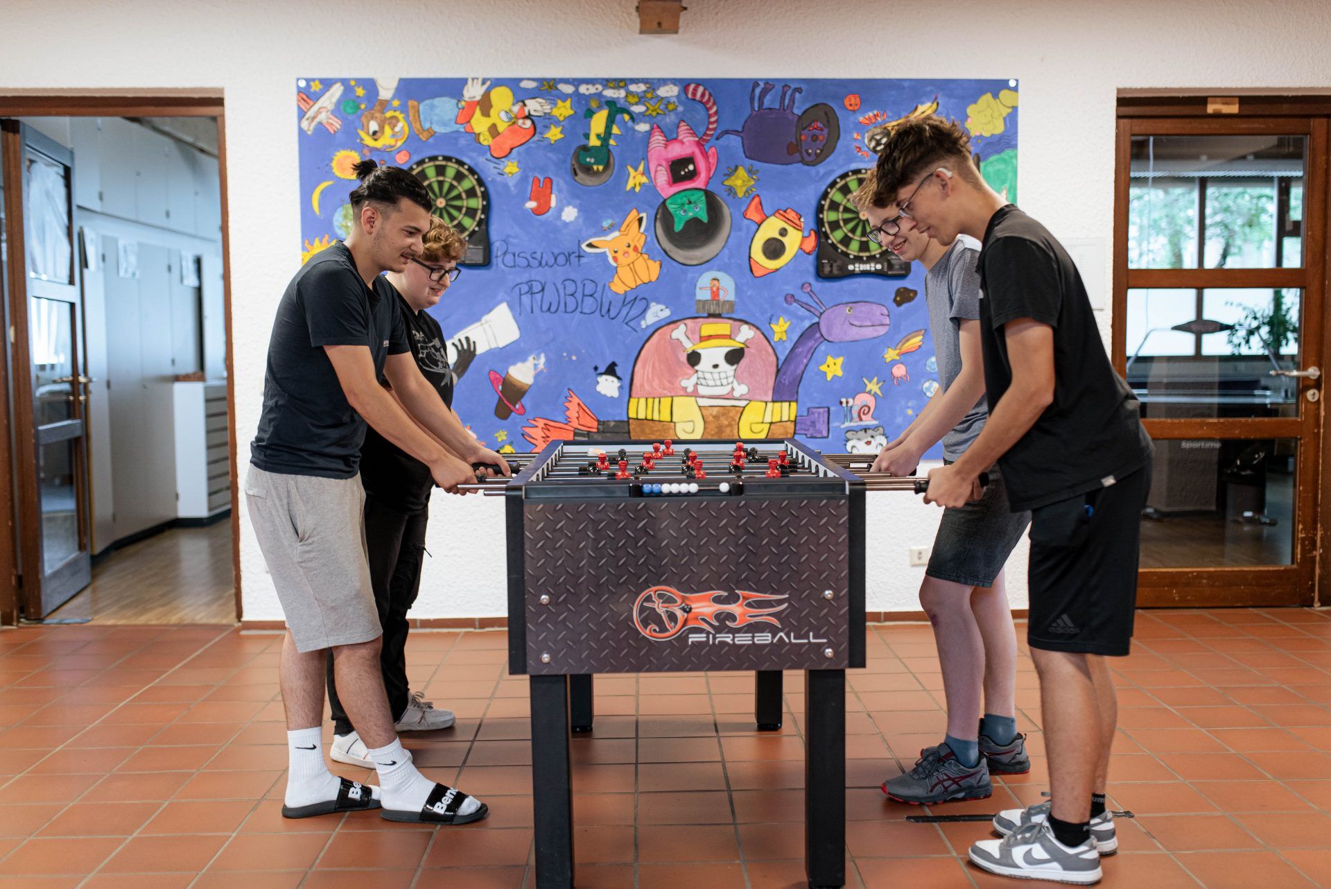 4 Jugendliche spielen im Freizeithaus an einem Tischkicker