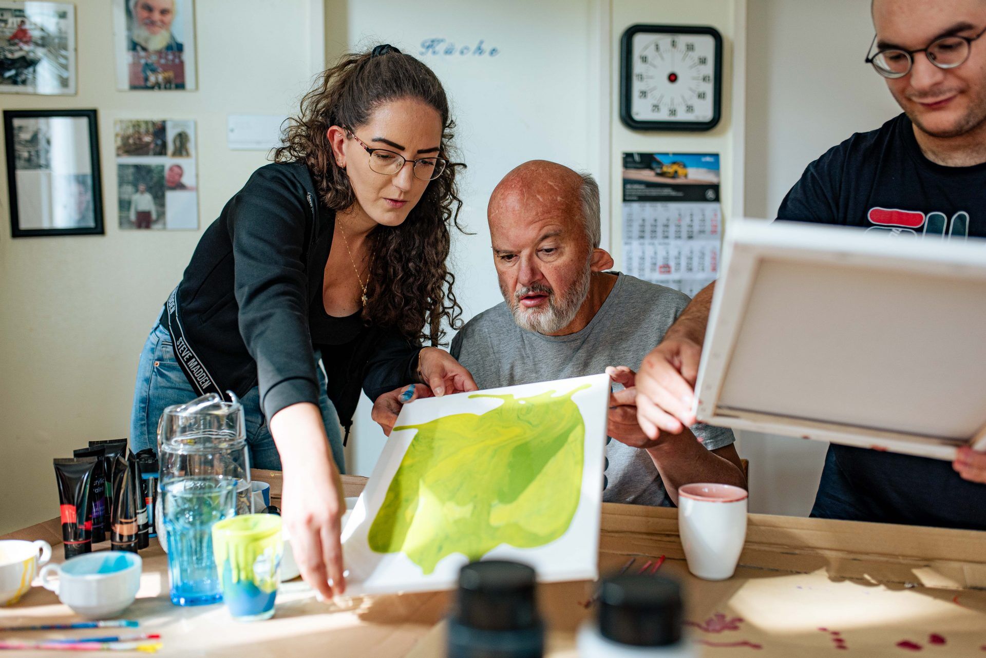 Pädagogische Fachkraft stellt mit zwei Klienten ein Bild mit Acrylfarben her