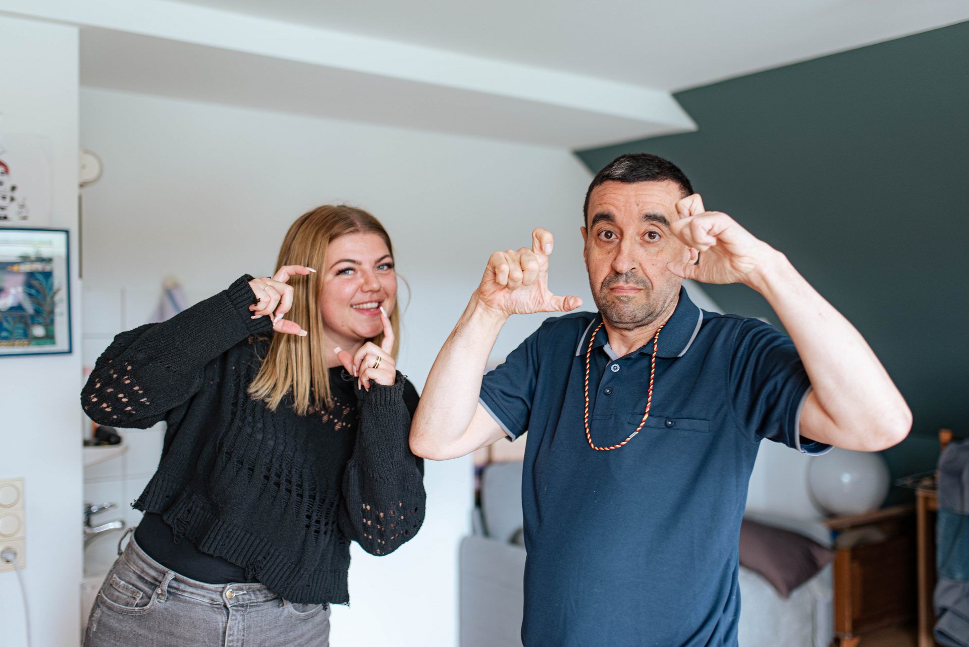 Pädagogische Fachkraft posiert mit Klient für ein Foto